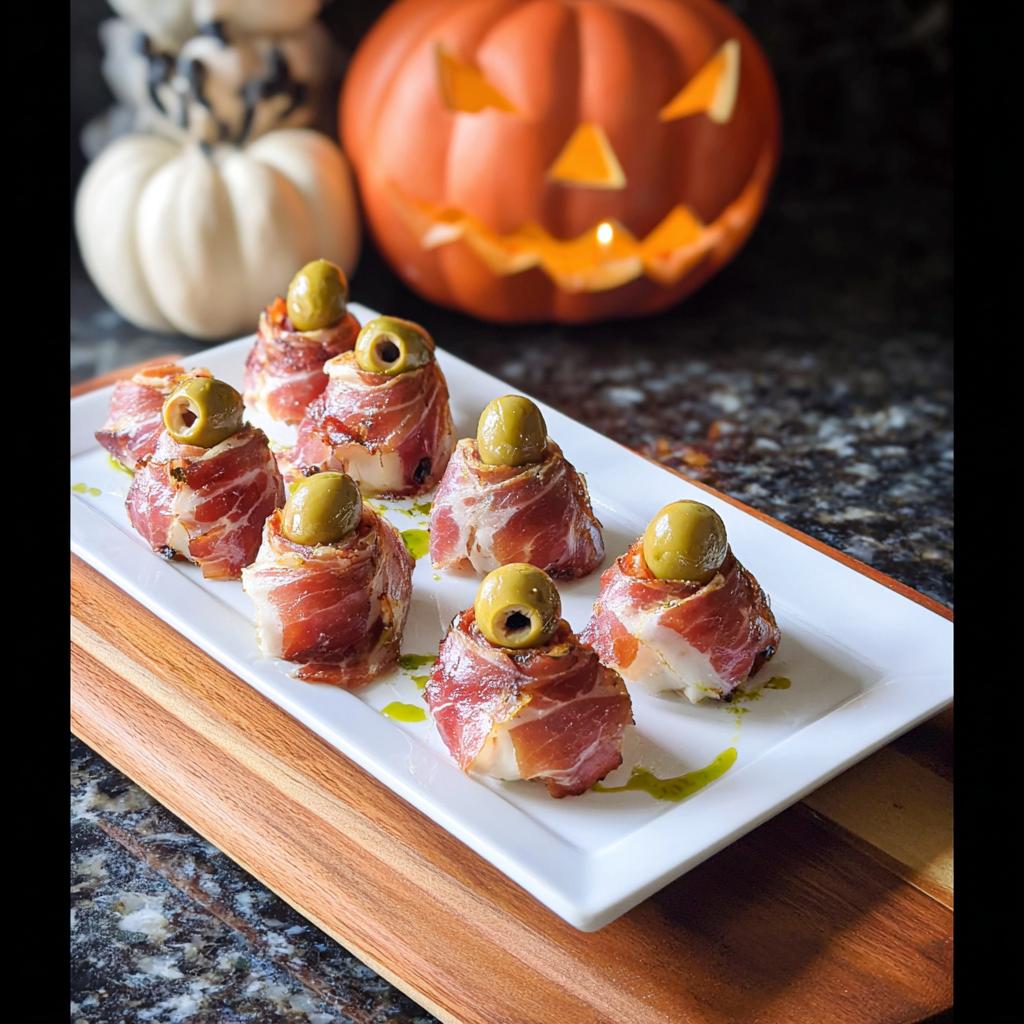 Once your prosciutto is wrapped snug, it’s time for the pupil! Place one of those olive halves right into that little socket you made on top of the mozzarella. And voilà! You’ve got yourself a creepy eyeball!