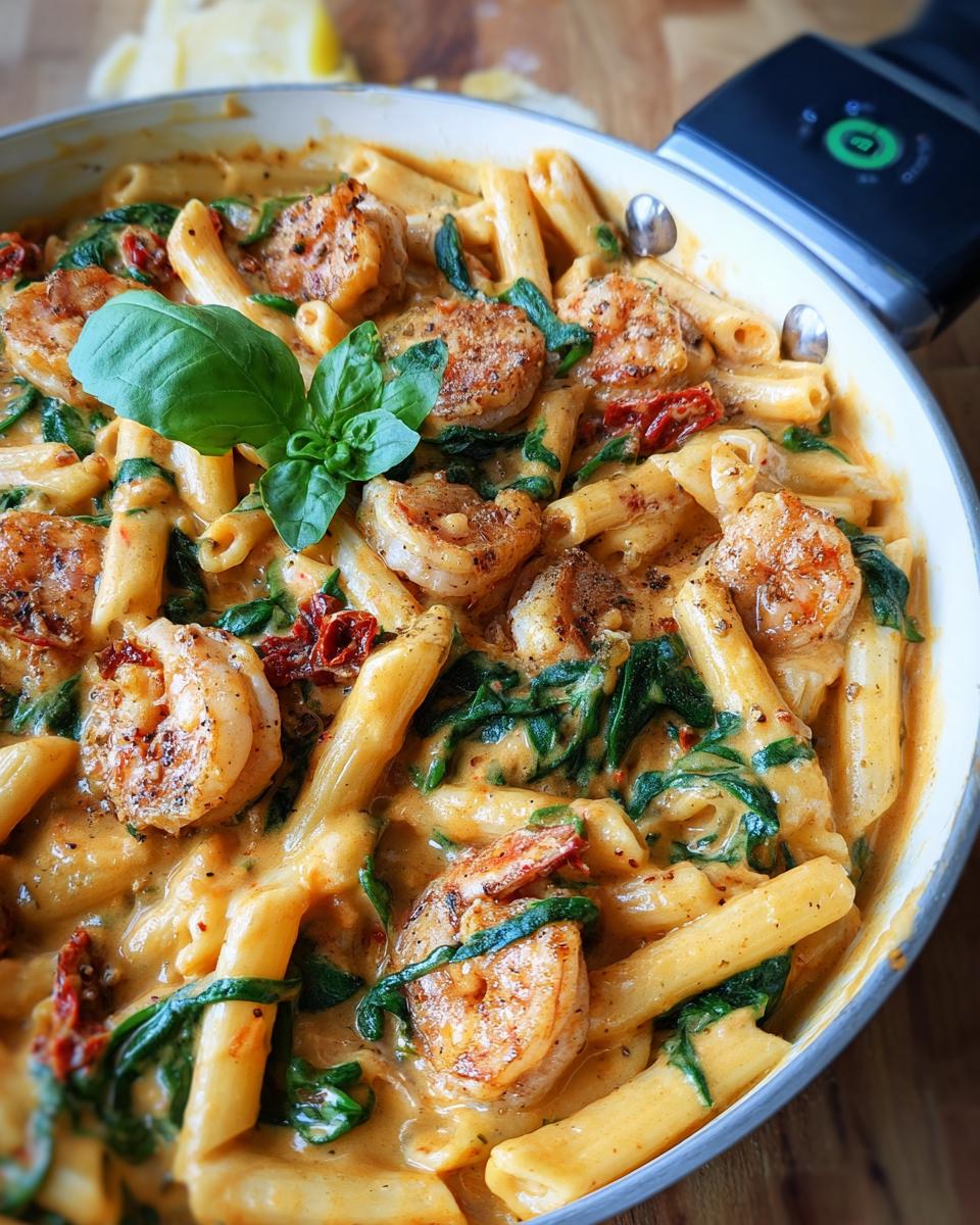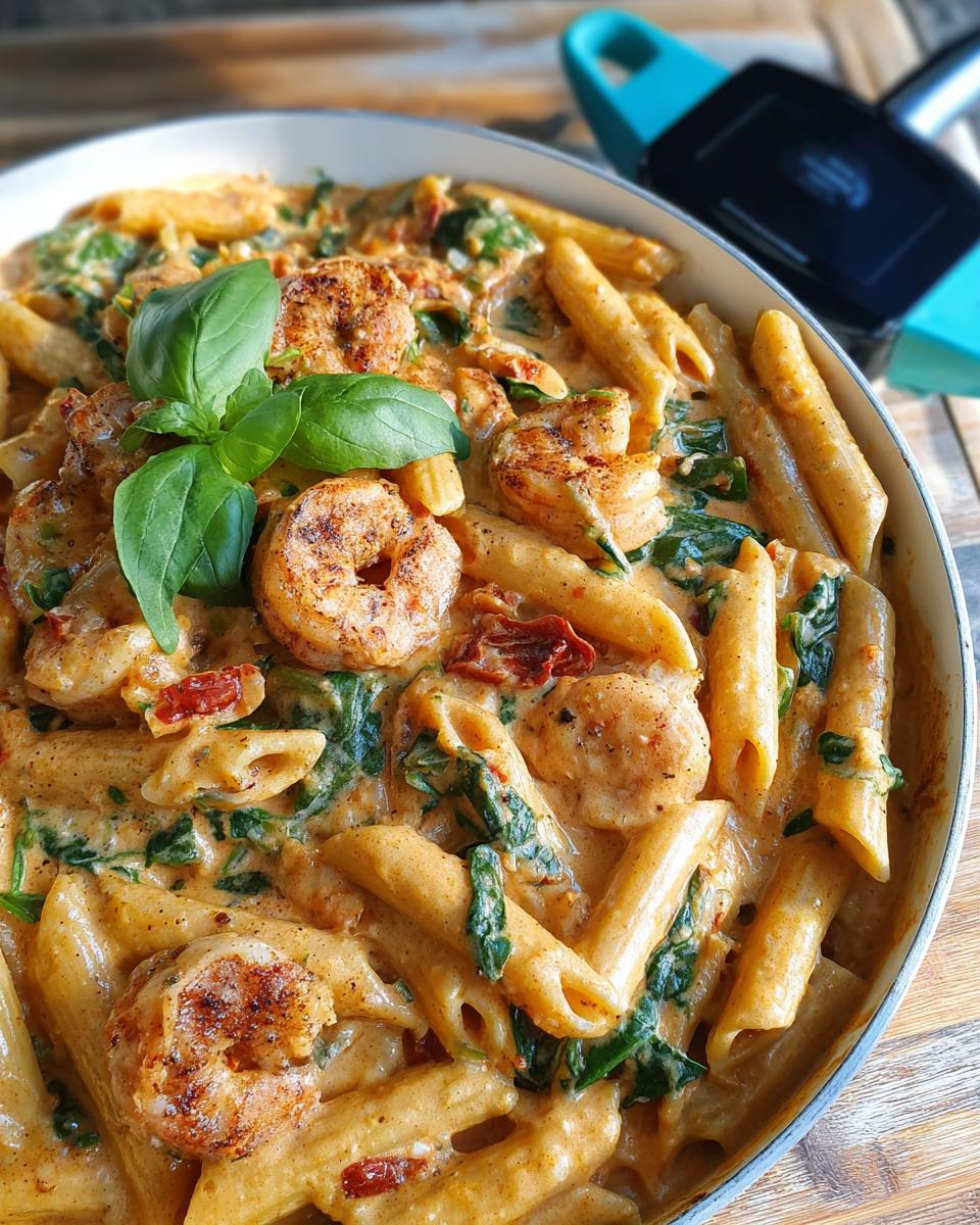 While your pasta is doing its thing, let’s get the shrimp ready. Toss those lovely peeled and deveined shrimp in a medium bowl with the smoked paprika, Italian seasoning, salt, and pepper. Make sure they’re all coated! Then, heat up that sun-dried tomato oil in your big skillet over medium heat. Cook the shrimp for just about two minutes on each side until they turn pink and C-shaped. Quick tip: don’t overcook them, or they’ll get tough! Set them aside once they’re done.